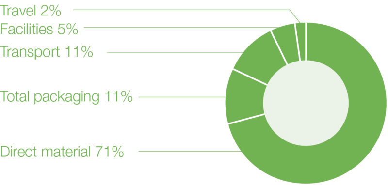 In 2020, our supply chain’s estimated emissions was 234,381 tonnes CO2e. The emissions calculations were made based on the Greenhouse Gas Protocol (GHG) Standards and include Scope 1, 2 and 3 emissions. Direct materials such as metals, plastics and chemicals account for the bulk of our emissions.